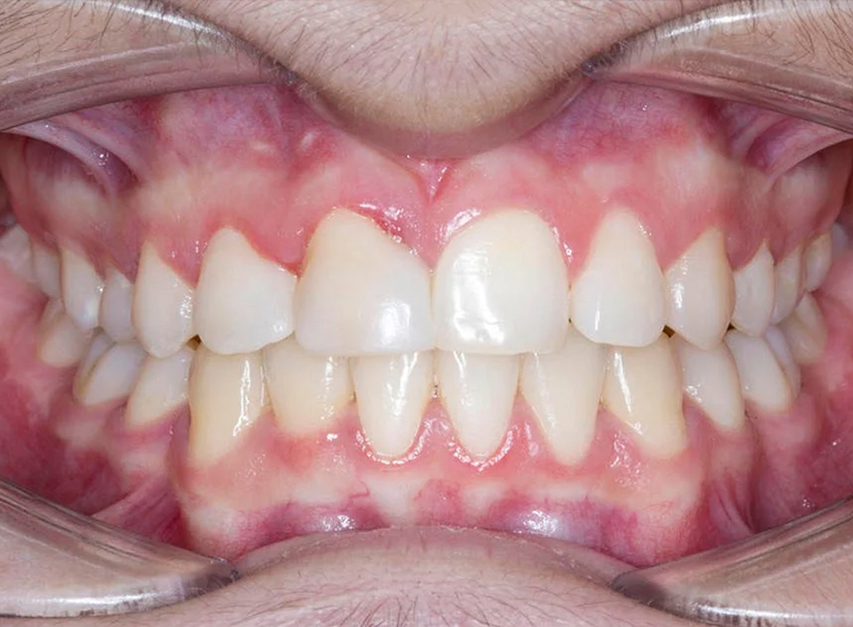 Composite restoration of an UR3 to resemble an UR1 following orthodontic treatment.