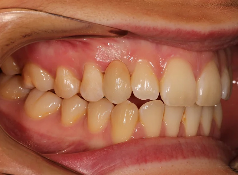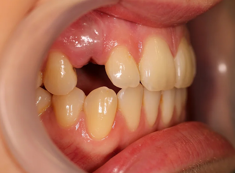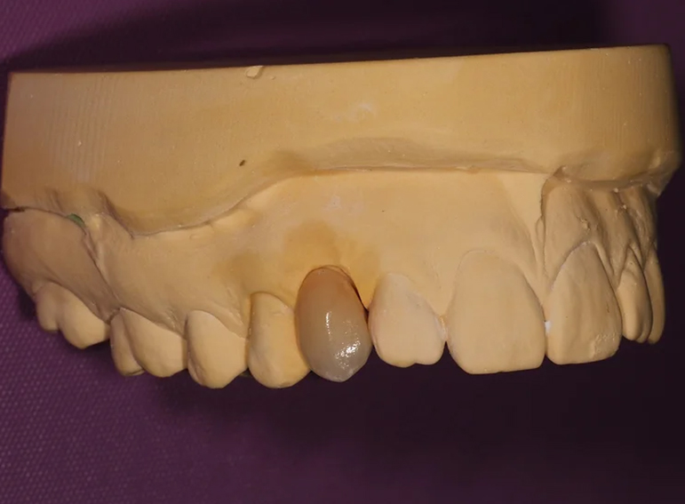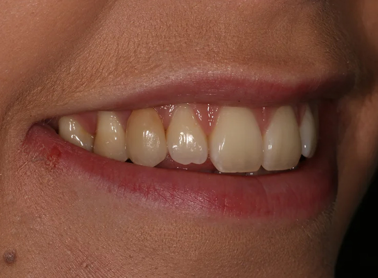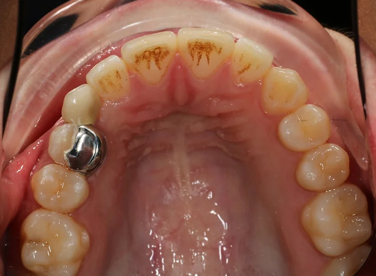 Missing canine replaced with an adhesive bridge.