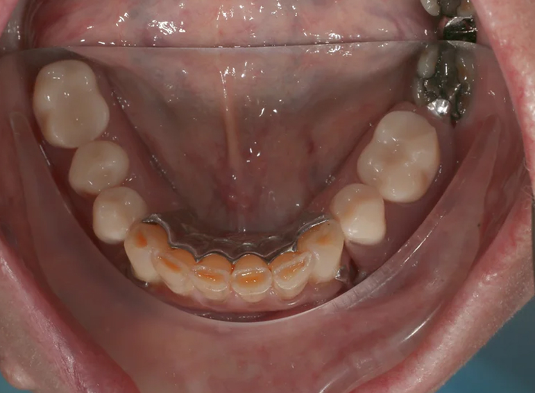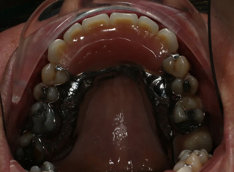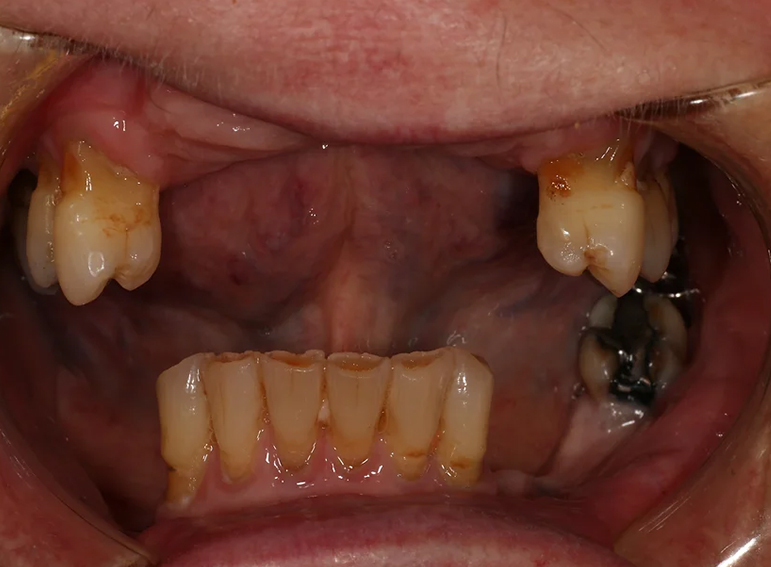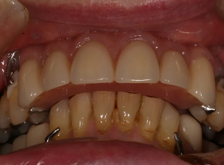Upper and lower denture for a patient with dementia and a skeletal discrepancy.