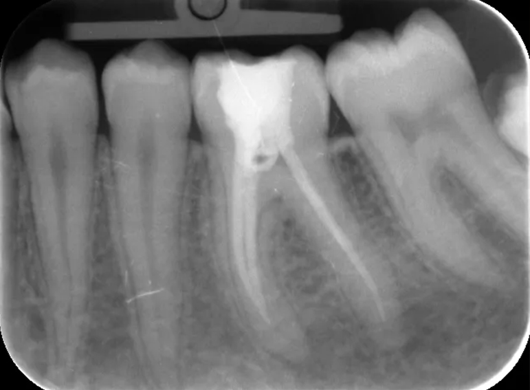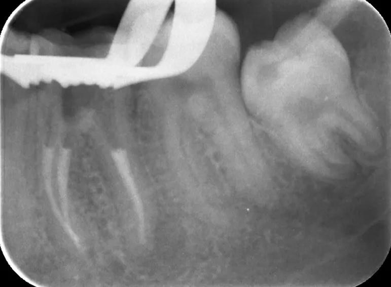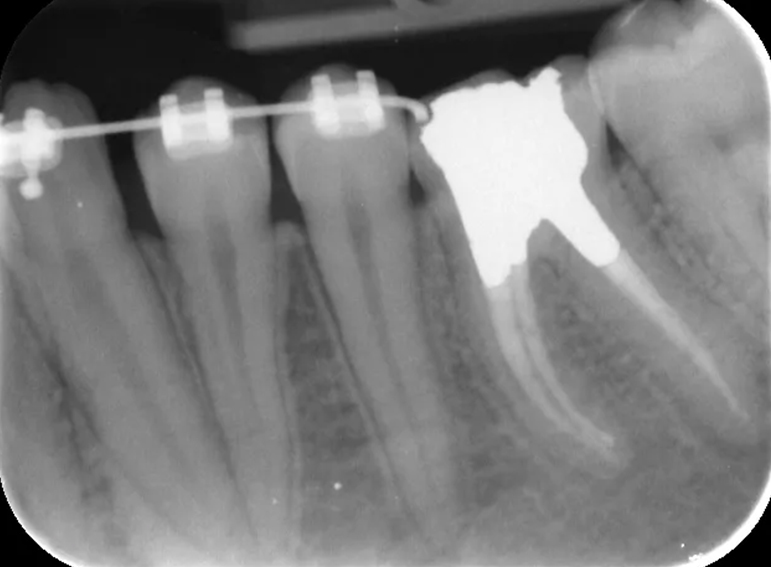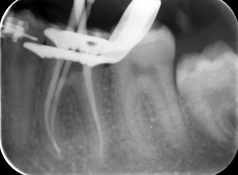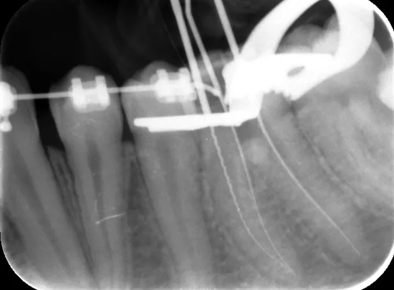 Root filling revision of a lower molar.