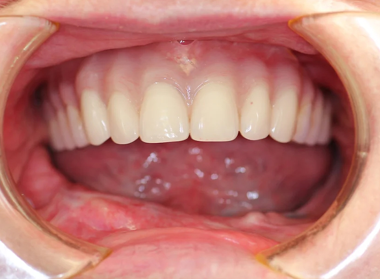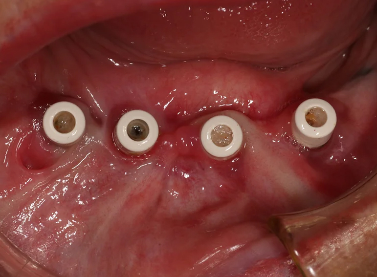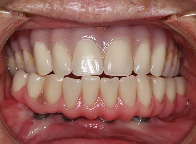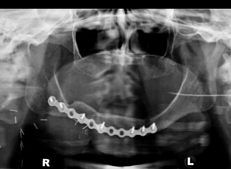 Full arch jaw reconstruction with dental implants placed into the leg bone.