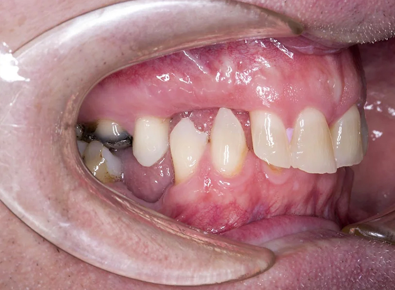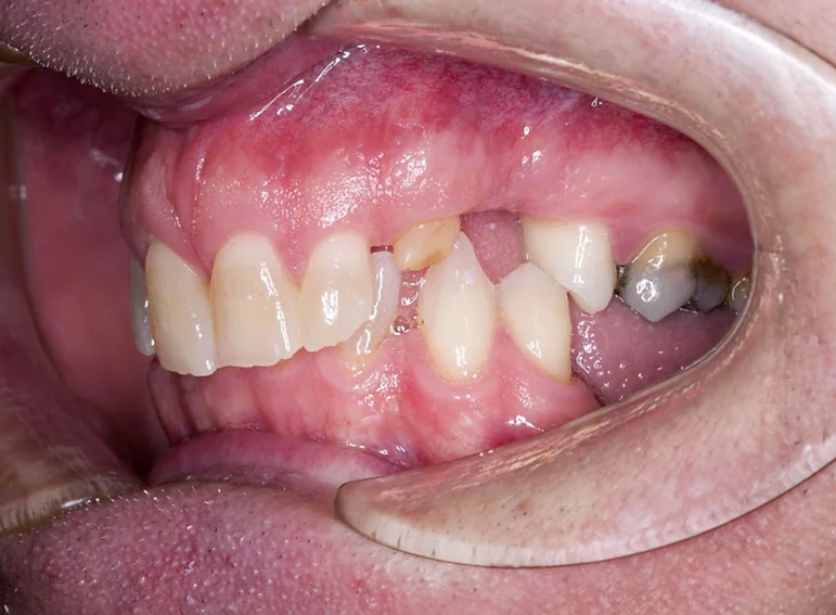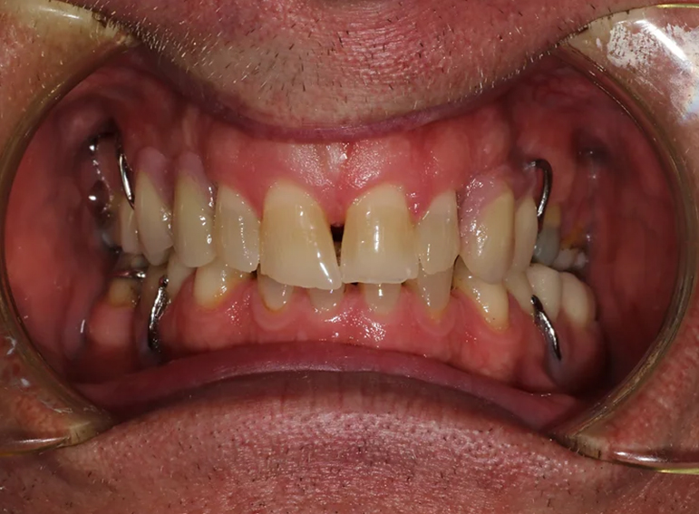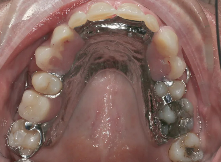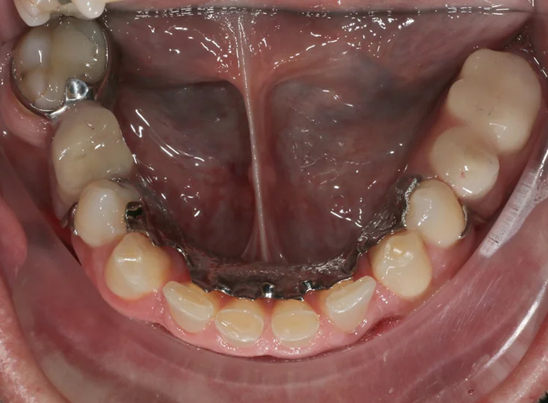 Upper and lower partial denture at an increased vertical dimension.