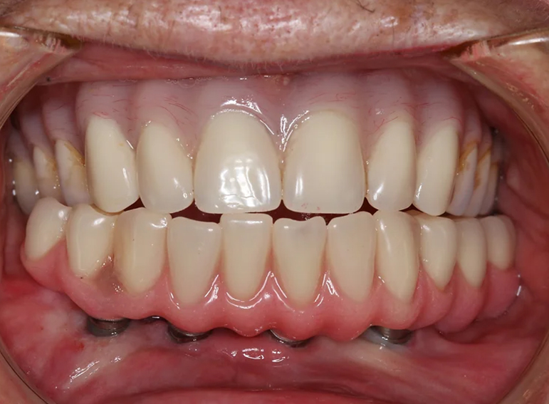 Upper and lower dentures (with implants) after broken jaws.